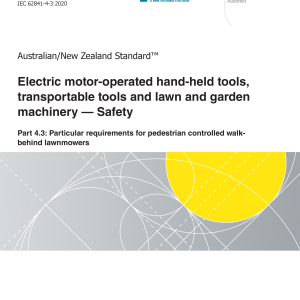 AS/NZS 62841.4.3:2021 applies to the design of pedestrian controlled walk-behind cylinder lawnmowers; and rotary lawnmowers equipped with metallic cutting means; and/or rigid non-metallic cutting means; and/or non-metallic cutting means with one or more cutting elements pivotally mounted on a generally circular drive unit, where these cutting elements rely on centrifugal force to achieve cutting, and have a kinetic energy for each single cutting element of greater than 10 J. This Standard will supersede AS/NZS 60335.2.77:2002 three years from the date of publication (i.e. on 26 November 2024). During this period AS/NZS 60335.2.77:2002 will also remain current. Regulatory authorities that reference this Standard in regulation may apply these requirements at a different time. Users of this Standard should consult with these authorities to confirm their requirements.