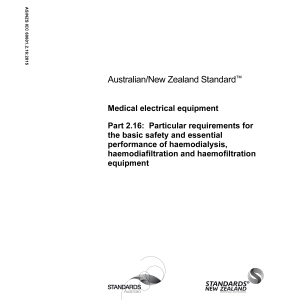 Adopts IEC 60601-2-16, Ed.4.0 to specify basic safety and essential performance requirements for haemodialysis, haemodiafiltration and haemofiltration equipment. It does not take into consideration the dialysis fluid control system of haemodialysis equipment using regeneration of dialysis fluid and central delivery systems. It does take into consideration the specific safety requirements of such haemodialysis equipment concerning electrical safety and patient safety. To be read in conjunction with AS/NZSIEC60601.1:2015.