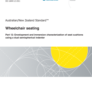 AS/NZS ISO 16840.12:2024 identically adopts ISO 16840 12:2021, which specifies apparatus, test methods, and disclosure requirements for characterization of wheelchair seat cushion immersion and envelopment properties using indenters instrumented with pressure sensors