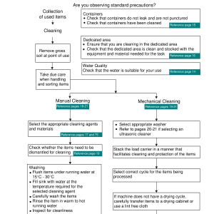 Quick-reference card, jointly prepared by Standards Australia and the Australian council on Healthcare Standards, for providing simple ‘how to do it’ information and guidance, in the form of a flow chart, for the cleaning of reusable medical and surgical instruments and equipment in health care facilities. To be used in conjunction with AS 4187-1998.
