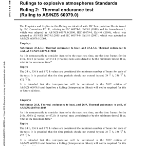 This Ruling provides clarification for enquiries as to the Standard AS/NZS 60079.0, Explosive atmospheres – Equipment – General requirements, Subclauses, 23.4.7.3, 23.4.7.4, 26.8, and 26.9. Ruling 2 – thermal endurance test. Table of contents Cited references in this standard Content history AS/NZS 60079.0:2008 [Available Superseded] Please select a variation to view its description. Published 07/03/2012 Pages 2 Please select a variation to view its pdf.