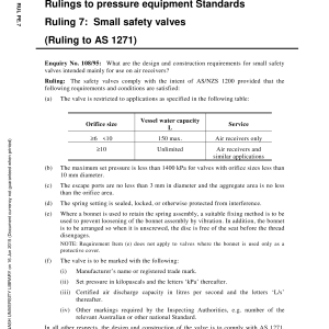 This Ruling provides clarification for enquiry No. 108/95, as to the Standard AS 1271: Safety valves, other valves, liquid level gauges, and other fittings for boilers and unfired pressure vessels, section 3. Ruling 7 – Small safety valves Table of contents Cited references in this standard Content history AS 1271-1997 [Superseded] RUL PE.7-2002 Rec:2016 Please select a variation to view its description. Published 27/06/2002 Pages 1 Please select a variation to view its pdf.